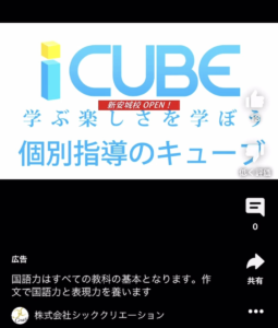 皆様こんにちは。 個別指導のキューブ 新安城校の鈴木です。 本日は、タイトルにもある通り Youtube広告についてです。 なんと私、先日初めて一視聴者として キューブの広告に遭遇しました! (嬉しくて画面
