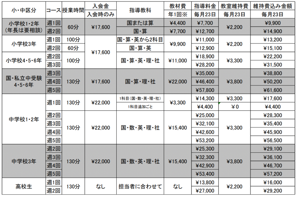 指導料金:口座引き落としにてお支払いください。引き落とし日は前月23日です。